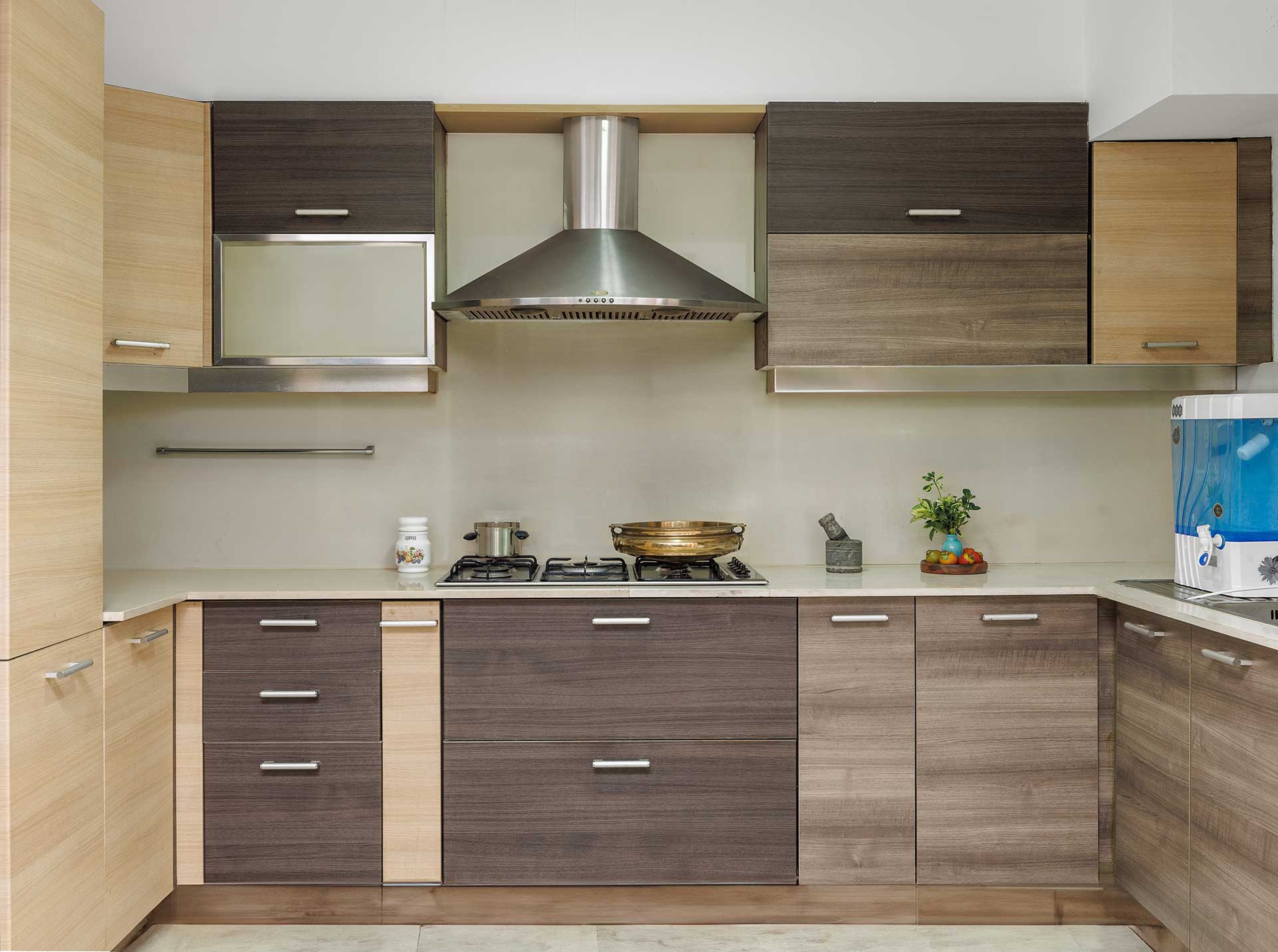 The modular kitchen is equipped with everything needed for self-cooking, featuring modern interiors and appliances that make meal preparation convenient and enjoyable.